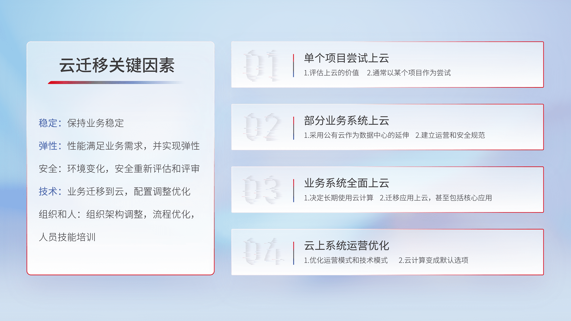 结合实际业务,,,,从规划设计、、、云平台选型、、云原生改造、、、、数据迁移、、、、集成交付,,,,迁移全过程为客户识别最佳上云路径,,做好风险识别管理,,设计网络架构、、身份权限、、、安全审计合规、、、操作审计、、、日志审计、、监控告警策略、、、、多站点容灾设计等,,,,对云上基础设施进行整体规划,,,提升IT治理水平,,以满足弹性、、、、高可用、、、、高性能的需求。。。。
